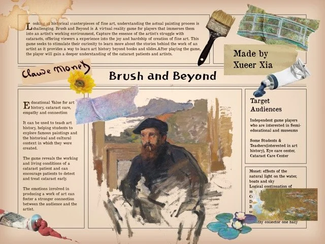Looking at historical masterpieces of fine art, understanding the actual painting process is challenging. Brush and Beyond is A virtual reality game for art history students that immerses them into an artist’s working environment, allowing them to experience the artist's perspective through the joy and hardship of creation of fine art. After playing the game, the player will gain a deeper understanding of the artist and their process.Additionally this game seeks to stimulate their curiosity to learn more about the stories behind the work of an artist as it provides a way to learn art history beyond books and slides.