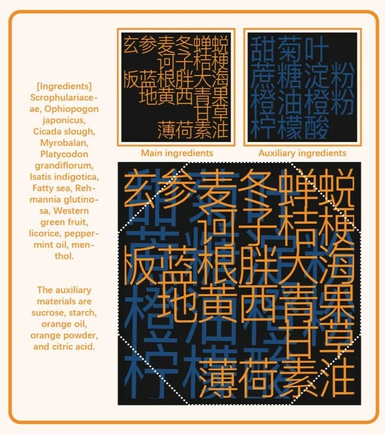 [Ingredients] Scrophulariaceae, Ophiopogon japonicus, Cicada slough, Myrobalan, Platycodon grandiflorum, Isatis indigotica, Fatty sea, Rehmannia glutinosa, Western green fruit, licorice, peppermint oil, menthol. The auxiliary materials are sucrose, starch, orange oil, orange powder, and citric acid.