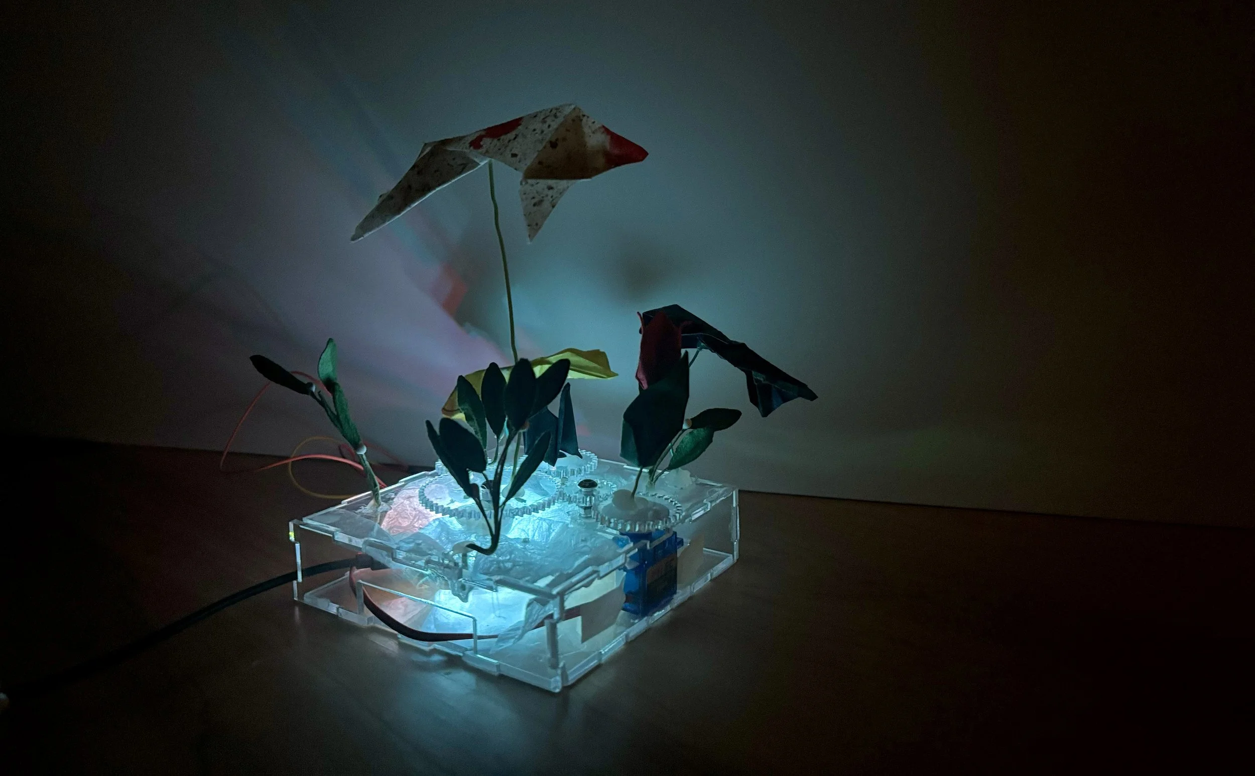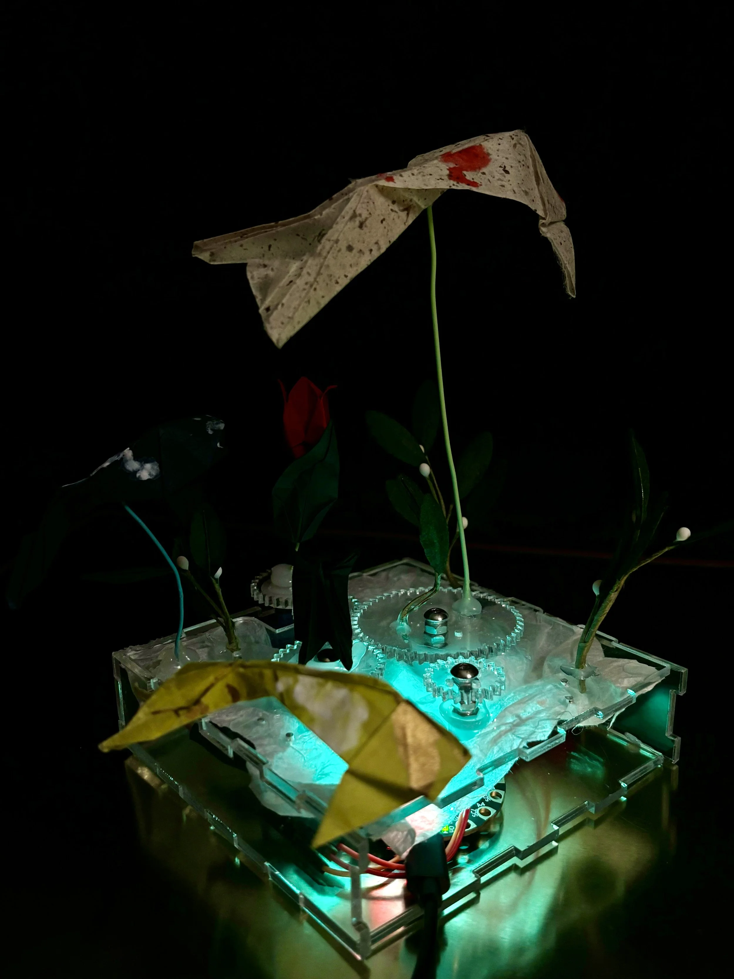 I used laser cutting to make many acrylic gears, which a single motor can move, making cats, flowers, and fish spin at different speeds. I made the designs with Adobe Illustrator and showed them on two acrylic boards. Even though some pieces broke and laser cutting didn't work as well as I hoped, after several tries, I managed to make five gears that work well.