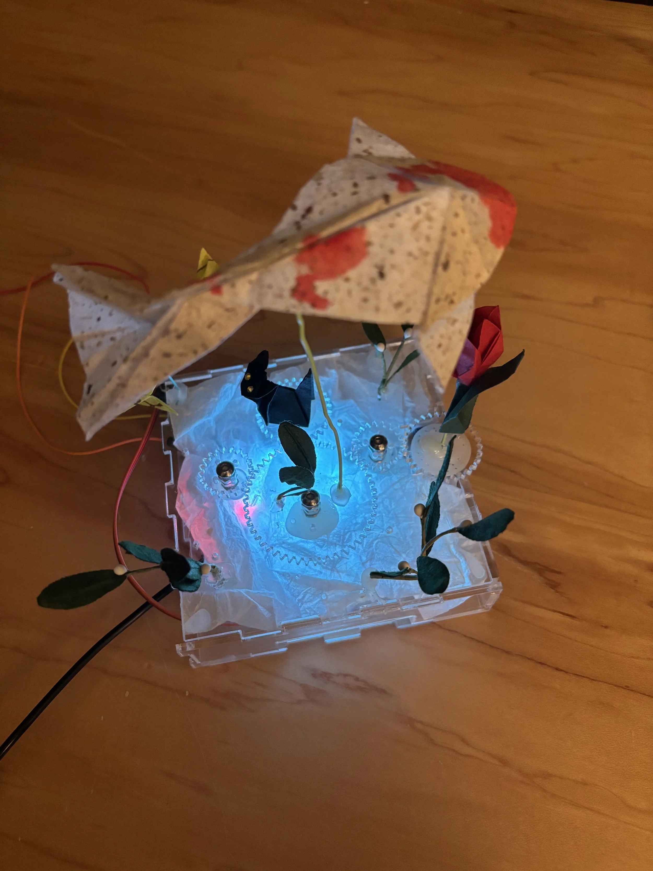 I experimented with various types of paper to evaluate their durability, gloss, and availability, alongside testing two different methods for folding fish. Unfortunately, some of the fish didn't survive the process of being attached to the gears. I want to express my heartfelt thanks to all of you; your support and guidance will always be remembered with deep gratitude (teary-eyed).